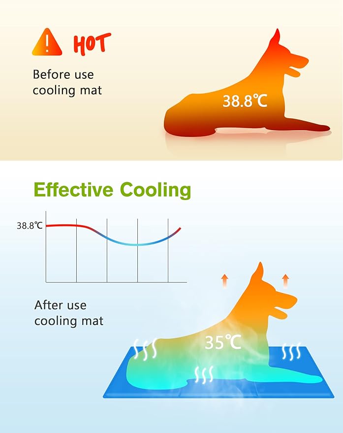 - 🐾【𝐒𝐄𝐋𝐅 𝐂𝐎𝐎𝐋𝐈𝐍𝐆】: Our cooling mat features an inner material that is gel, which is safe for both humans and pets. There’s no need to add water, freeze, or chill the mat, as it works by absorbing your dog’s body heat to keep them from overheating and becoming dehydrated in hot weather.